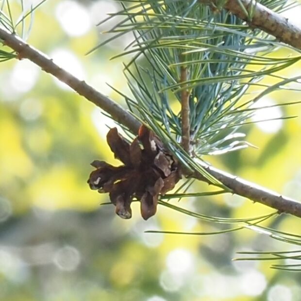ヒメコマツはゴヨウマツともよばれます。 平地に多いアカマツやクロマツは、 2本の葉で1つの束になっていますが、 ゴヨウマツは、 5本の葉で1つの束になっています。 本来は山や岩の上などに生えますが、 庭木や盆栽にされることも多いので、 意外と身近な場所で見ることができます。