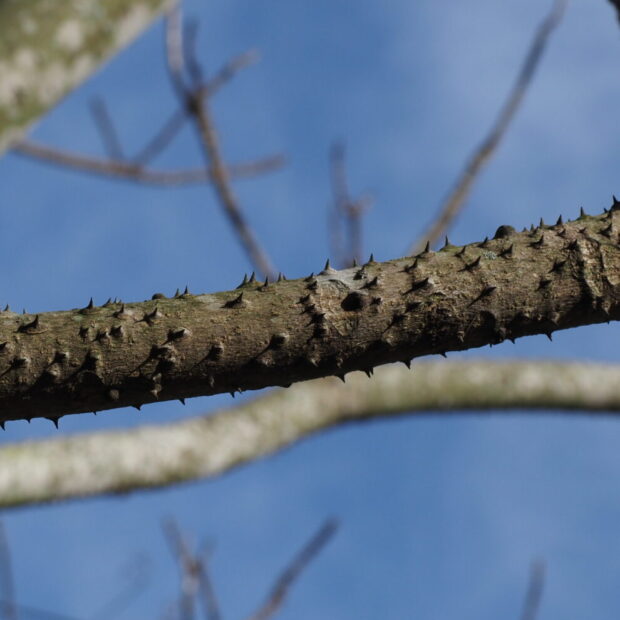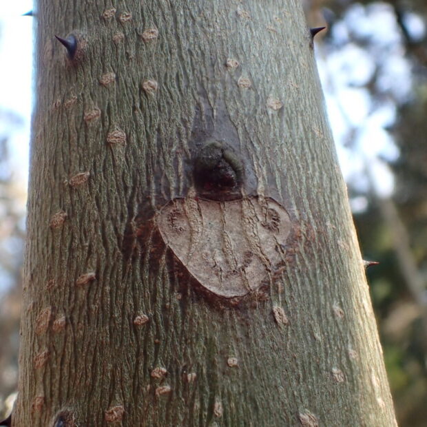 幹は灰色がかった茶色で短いトゲがたくさんあります。 老木になるとトゲの先がなくなり、 いぼのようなふくらみがポツポツと残ります。 ちなみに、 トゲは葉の軸にもあります。