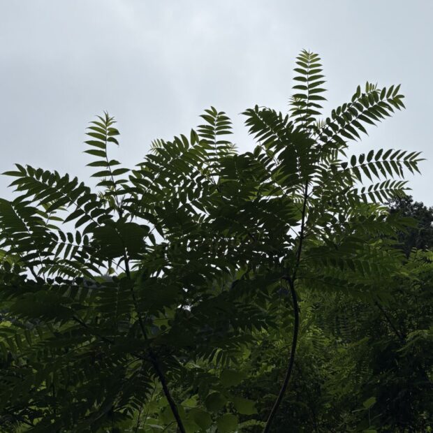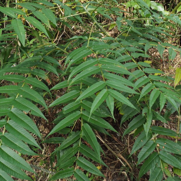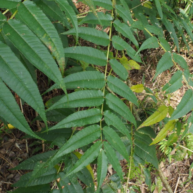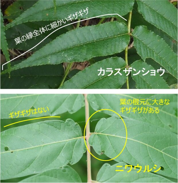 カラスザンショウとニワウルシは葉の様子が似ています。 カラスザンショウの葉の縁には細かいギザギザがありますが、 ニワウルシのギザギザは、 ゆるいものが小さな葉の元の方に2〜3対あるだけです。