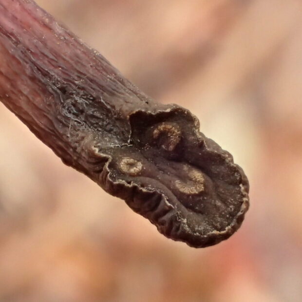 太い枝にとげとげ、 大きくて丸い葉痕の上に「グー」のような形の芽、 というのが特徴です。 芽鱗は3枚。 葉痕の維管束痕はCの形をしていて3つあり、 きかんしゃトーマスのようなにっこり顔に見えます。