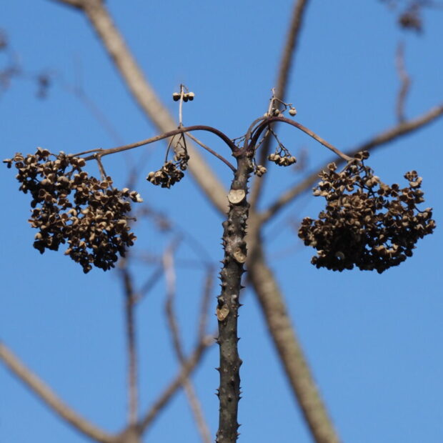 名前の通りサンショウの親戚のような木で 確かに葉や花や実の形、 幹や枝がトゲトゲなのはサンショウによく似ています。 ですが、 葉も木の大きさも巨大でサンショウをイメージする人は少ないと思います。 葉をもむとさわやかな香りがします。