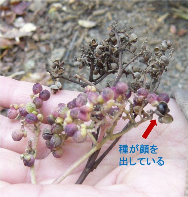 ポツポツとした油点のある丸い実がたくさんつきます。 秋から冬、 熟すとパカッと3つに割れ、 中から黒くてツヤツヤの種が出てきます。 普通のサンショウの実と似ています。
