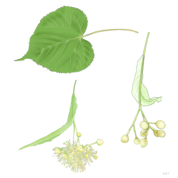 ハート型の葉、 クリーム色で香りのよい花、 プロペラのついた実の房など、 一年中見どころの多い木です。 昔から、 樹皮の繊維で着物や縄などが作られ、 生活に役立ってきました。 花は蜂蜜を取るための蜜源として利用されます。