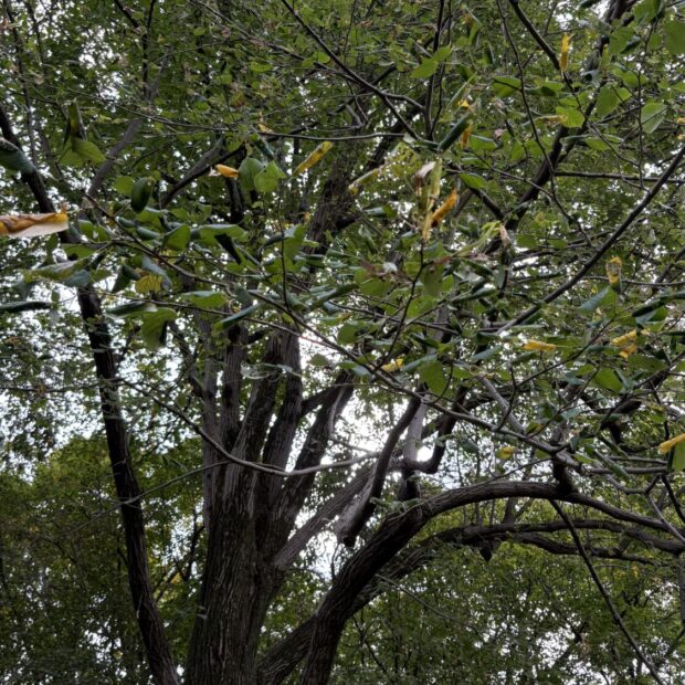 短い毛のある丸い実が房になってつきます。 1房の柄に1枚、 細長い葉っぱのようなものがついています。 実が熟すと、 その葉っぱがヘリコプターのプロペラのような役割をし、 風に乗ってクルクル回りながら実を遠くへ運びます。