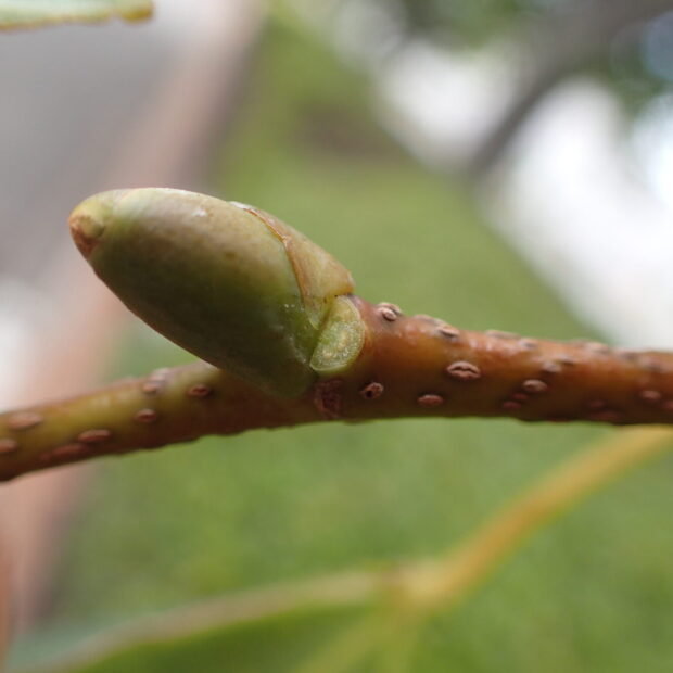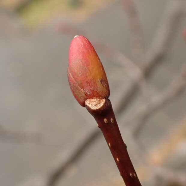 赤みがあって先が丸く、 毛のないつるりんぷっくりな芽です。 芽鱗はつるりんと1枚大きなのと、 横に小さなのが添えてあるように見えるのが特徴です。 半月型の葉痕には維管束痕が3つあり、 ちょっとぼんやりしたお顔に見えます。