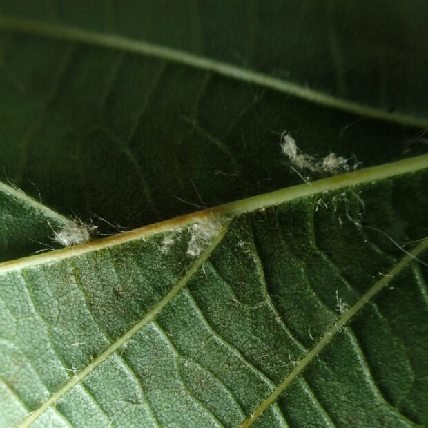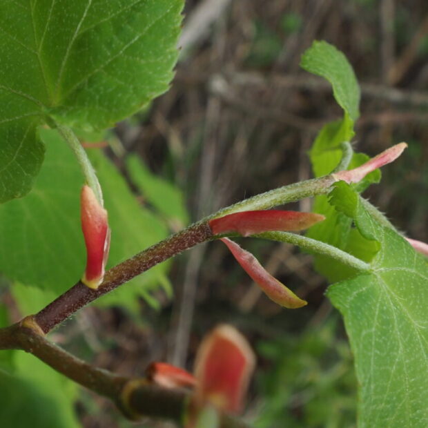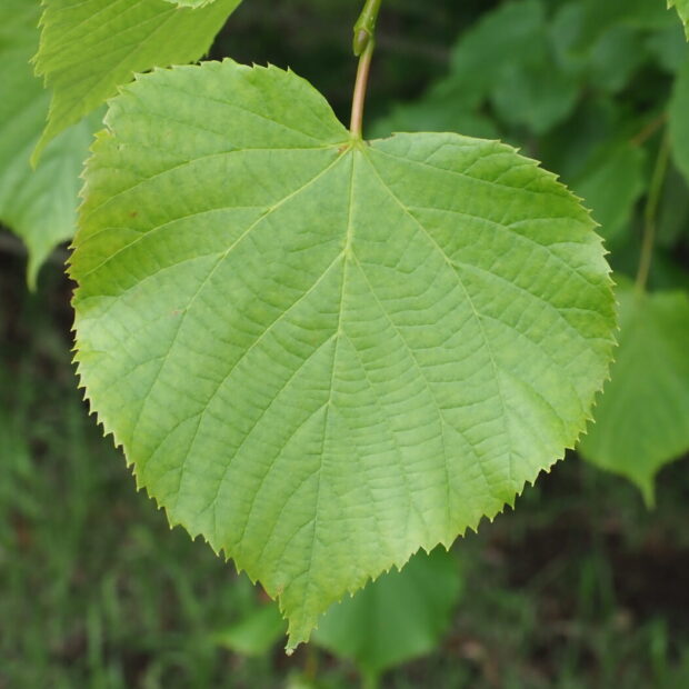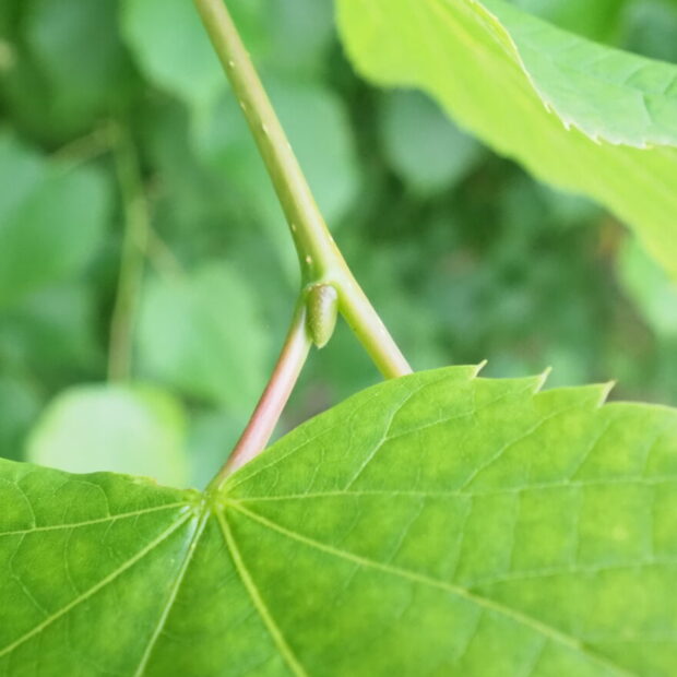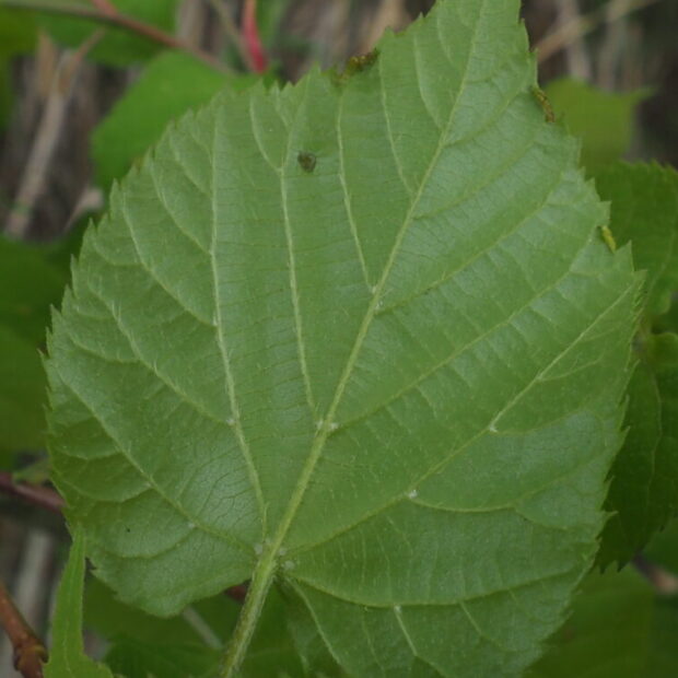 少しゆがんだハート型で縁にはギザギザがあり、 先はヒュンととがります。 葉の裏の葉脈のわかれめ(腋脈)にモシャっとした毛のかたまりがあるのが特徴で、 その他は毛がなくてすべすべです。