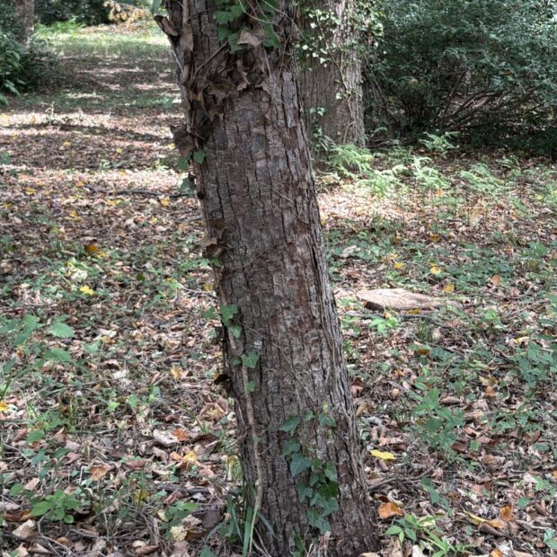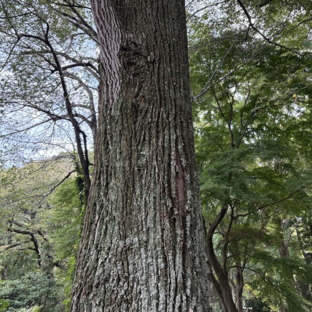 若い木の樹皮は灰色っぽい明るい色をしていますが、 だんだんと縦に裂け目が入ってきて褐色を帯びた暗い色になっていきます。