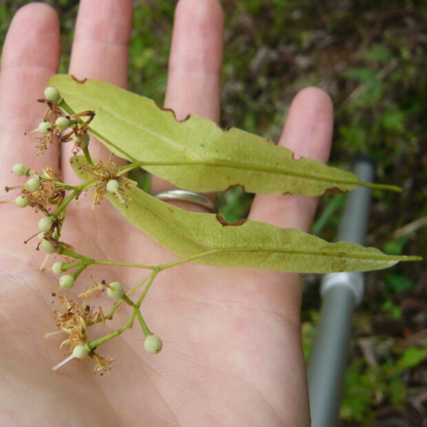 初夏、 葉のつけ根から伸びた柄の先に、 房のようになって小さな花をいくつか咲かせます。 花の柄には1房ごとに1枚ずつ、 細長くて葉より少し色の薄い、 葉っぱのようなものがつきます。 遠くからでもわかる甘い香りがします。