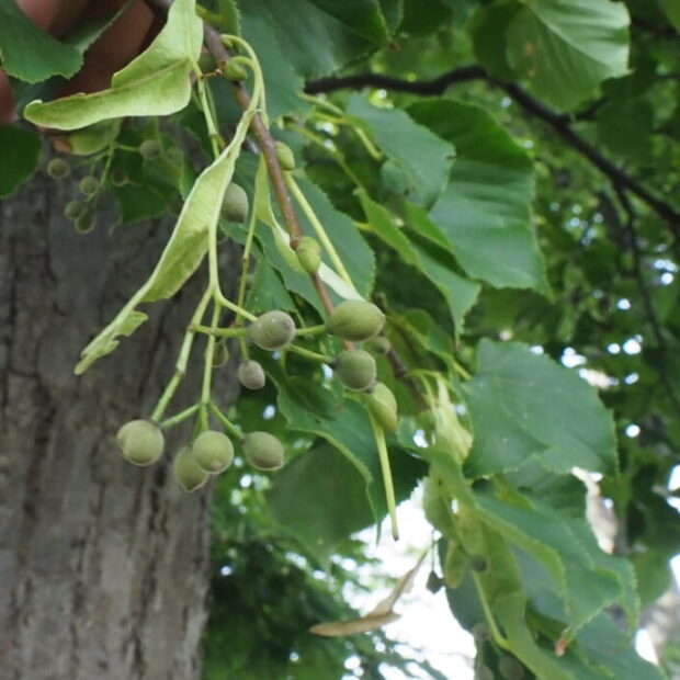 ハート型の葉、 クリーム色で香りのよい花、 プロペラのついた実の房など、 一年中見どころの多い木です。 昔から、 樹皮の繊維で着物や縄などが作られ、 生活に役立ってきました。 花は蜂蜜を取るための蜜源として利用されます。