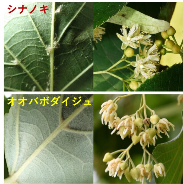 シナノキは、 北陸・関東北部から北海道までの山地に自生するオオバボダイジュとよく似ています。 オオバボダイジュの葉は大きくて、 裏面全体から葉柄にかけてやわらかい星状毛があり、 白っぽい色をしています。 花の雄しべは花びらより短いのが特徴です。 新しい枝、 実、 冬芽もやわらかい星状毛でおおわれています。