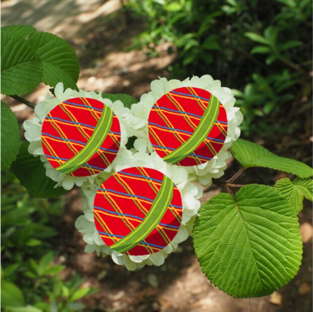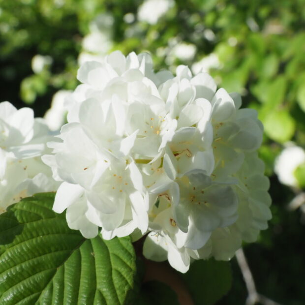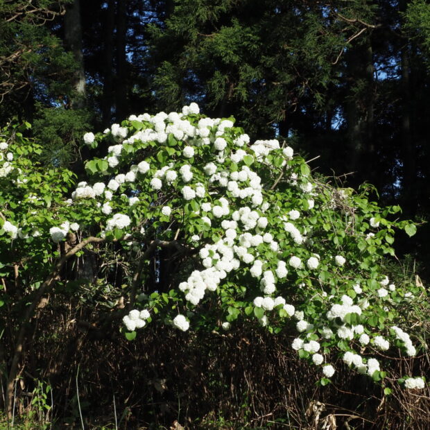 小さな白い花が集まって手まりのような形になり、 ポンポンポンと枝に咲きます。 一つ一つの白い小さな花は、 5つに深く切れ込んだ花びらが変化した装飾花で、 雌しべと雄しべは退化しています。