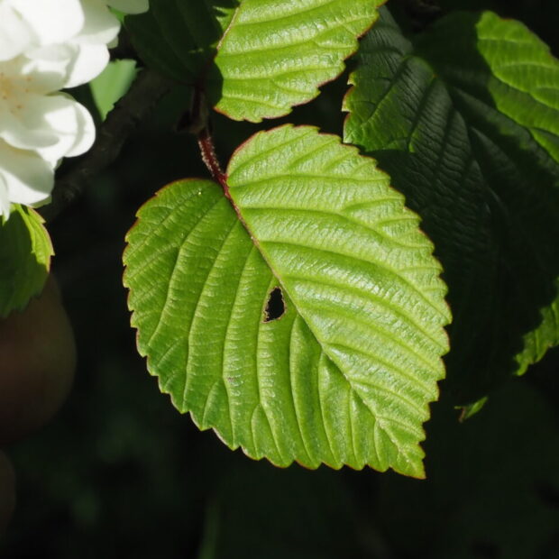 幅の広い丸い形で少しつやがあり、 厚みもある葉です。 縁のギザギザははっきりとしていて、 先は少しとがります。