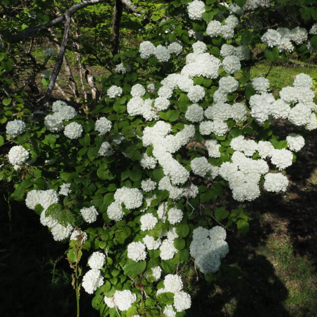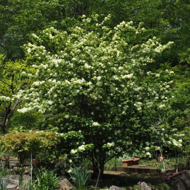 白いアジサイ似の小さめな手まりのような花が、 枝にポンポンポンと並んで咲きます。 園芸種として生まれ、 古くから栽培されてきました。 もとになったのは、 本州の日本海側に生えるケナシヤブデマリであるといわれています。