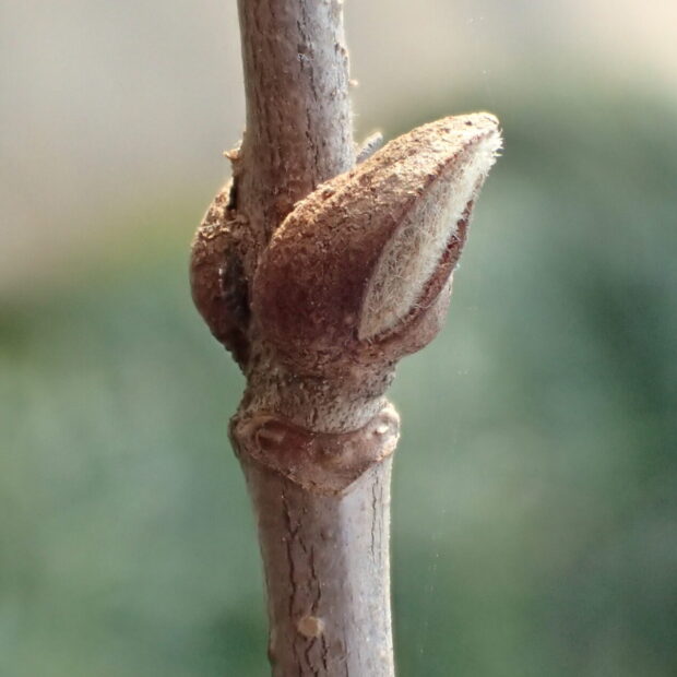 茶色の2枚の芽鱗に包まれた、 しずく型の冬芽です。 葉痕の維管束痕は3つで、 お顔に見えます。