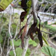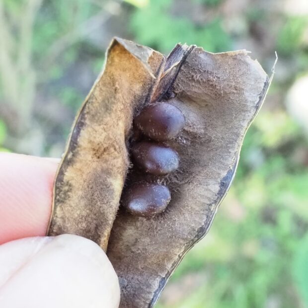 秋にはこげ茶色の豆の鞘がたくさんぶら下がり、 花の時期とは全く違う雰囲気になります。