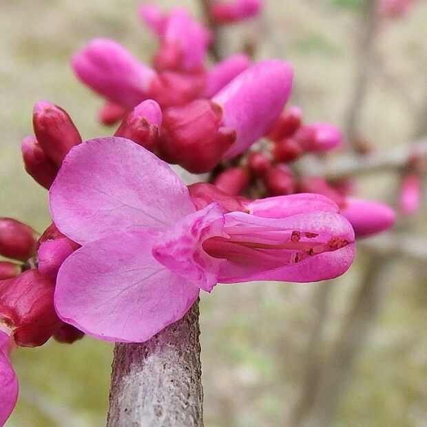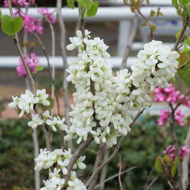 春に葉が大きくなる前に枝や幹にびっしりと咲く小さなピンクの花がとても華やかです。 葉っぱはハート型です。