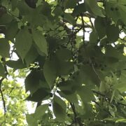 エノキは虫たちに人気の木。 日本の国蝶、 オオムラサキの幼虫はエノキの葉を食べて育ちます。 赤い小さな実は、 鳥たちの大好物です。