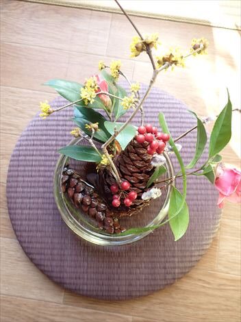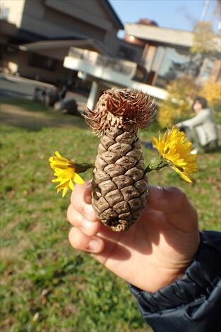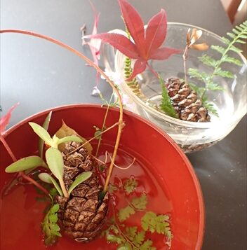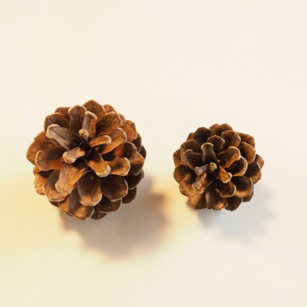 マツボックリは乾くと開き、 水につけると閉じます。 乾いた晴れた日に中の種を遠くに飛ばすために、 雨の日はしっかり閉じます。 そんなマツボックリにお花を挿して、 生け花をしてみましょう。 アカマツ、 ダイオウマツ、 ゴヨウマツのマツボックリでもできます。