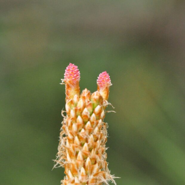 雄花は、 触ると粉のような花粉が飛びます。 雌花は小さな松ぼっくりのような形。 新しい枝の先端につきます。 これが受粉して松ぼっくりになります。