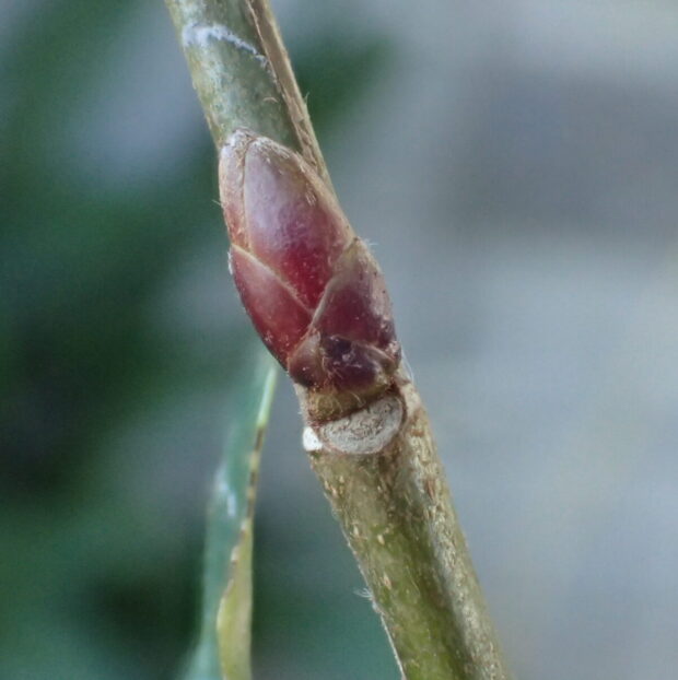 • 細い枝の芽は赤い。 半円形の葉痕もよく見える。