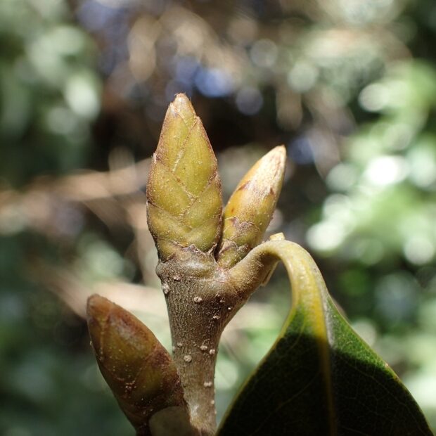 少し扁平な円錐形をした芽です。 葉よりも明るい緑色の芽鱗が、 何枚も重なっています。