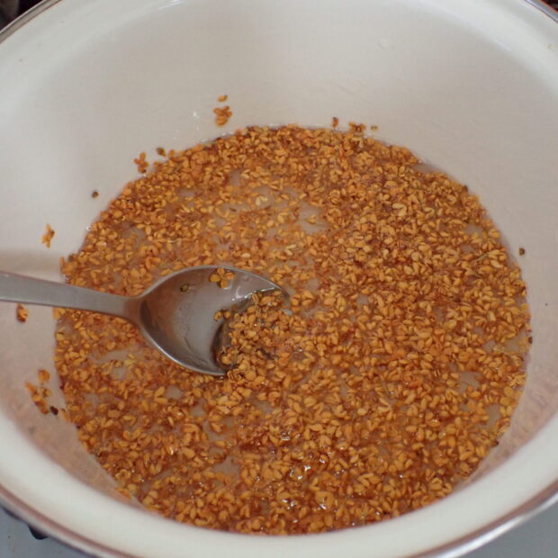 • 鍋にオリゴ糖(砂糖シロップでも可)と花を入れて、 沸騰する寸前で火をとめる。