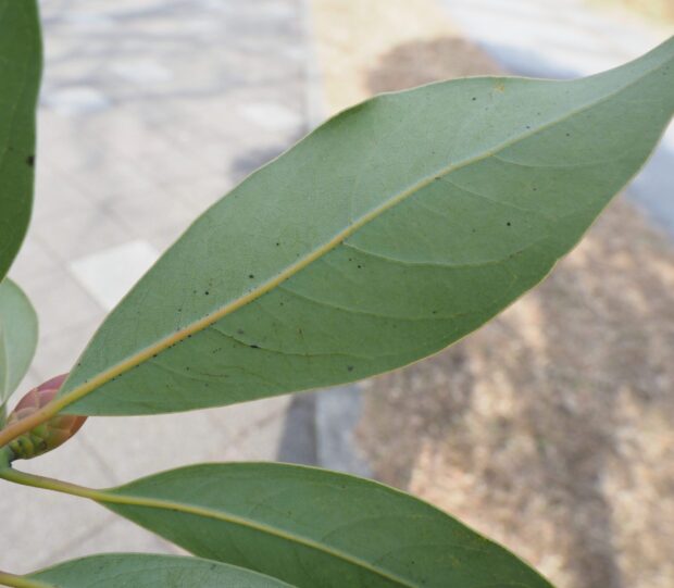 • タブノキの葉の裏。 表と色や光沢が全く違う。 裏は光沢がなく色が薄い。