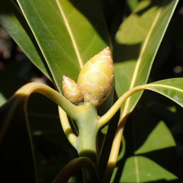 • 大きな冬芽の中心から新葉が出てきて、 その脇から花の蕾が出てくる