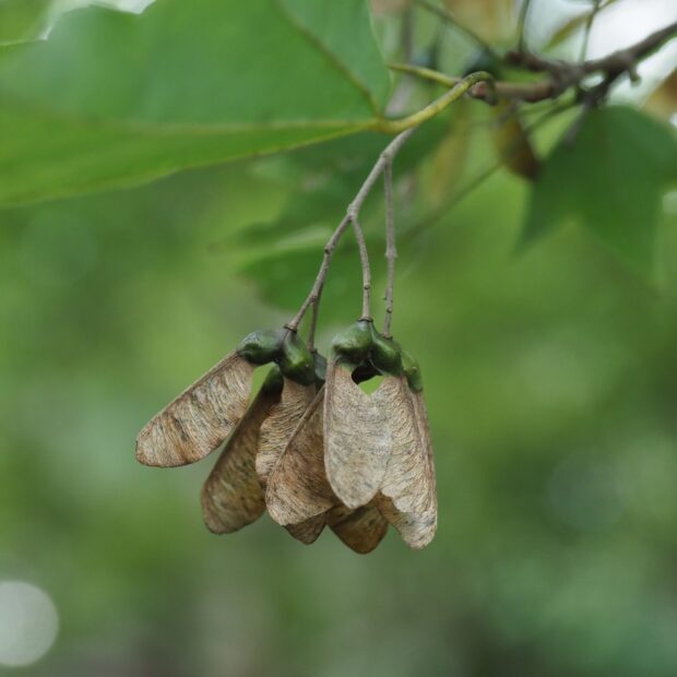 羽のついたブーメランのような種が二個ずつくっついて実ります。 真ん中で割って飛ばすと、 クルクル回りながら落ちます。