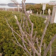 細長く扁平な冬芽です。 外側2枚の芽鱗は早いうちに落ち、 白い毛がほわほわと生える小さな葉で春を待ちます。 三角形の葉痕の維管束痕は1つです。