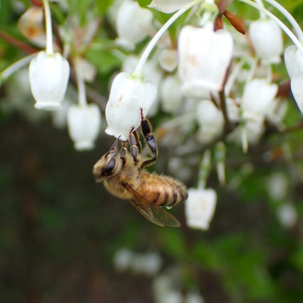 • セイヨウミツバチが逆さになりとまる。