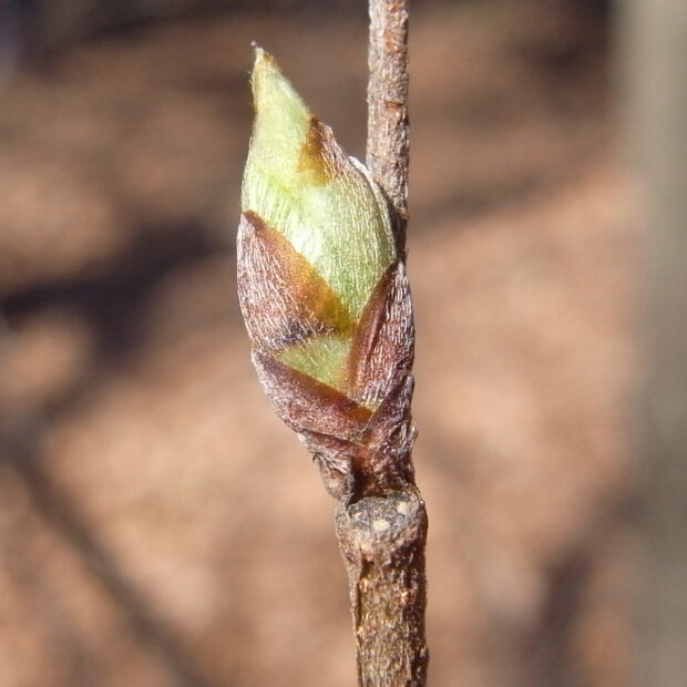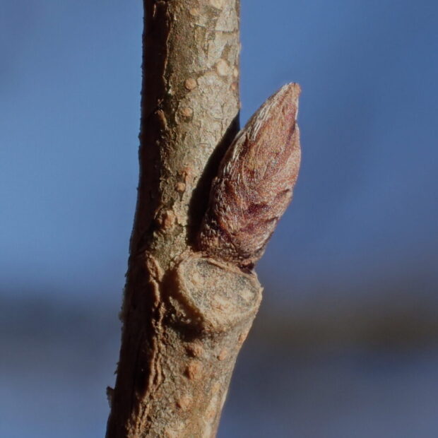 小さな細長い冬芽は、 枝に沿うように付きます。 白い毛のある芽鱗には赤みがかった縁取りがあります。