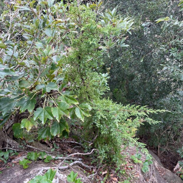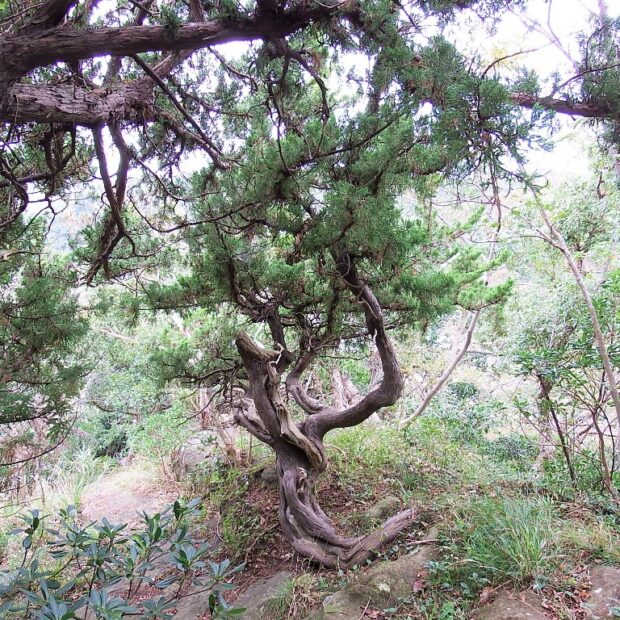 • イブキは岩場の上でもねじれながら根を伸ばし成長する