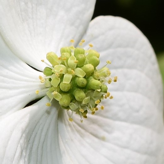 初夏に葉が出た後に花が咲きます。 花びらに見えるのは総苞片(そうほうへん)といい葉が変形したものです。 中心にある塊が、 じつは本当の花。 20~30個集まった花です。