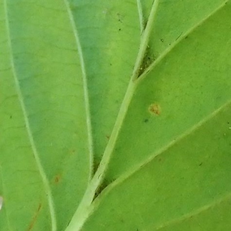 • 葉の裏の拡大。 脈の付け根(脈腋)に褐色の毛が生える。
