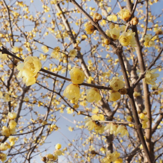 ロウバイよりもやや大きく、 花の中央部まで黄色いのが特徴です。