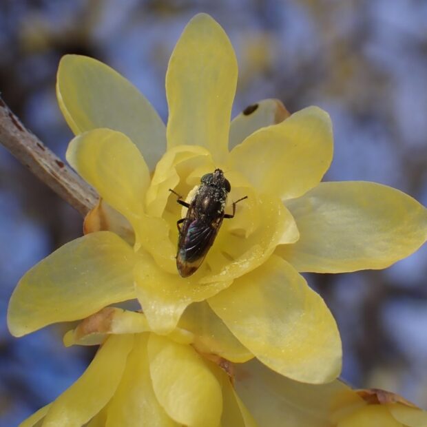 黄色い花は冬枯れの風景を明るくします。 甘い香りが強く、 この香りで数少ない虫を招きます。
