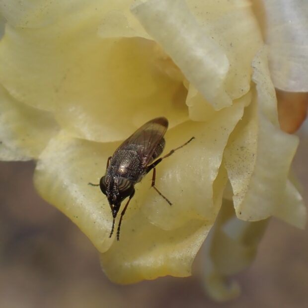 • ツマグロキンバエの体には花粉がついている。