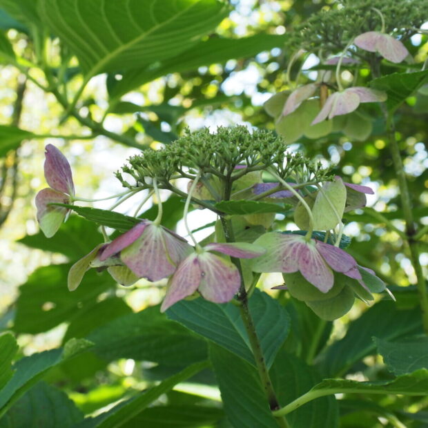 ガクアジサイからセイヨウアジサイなど多くの品種が生まれています。 すべて装飾花のアジサイ(ホンアジサイ)もガクアジサイから生まれました。