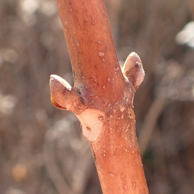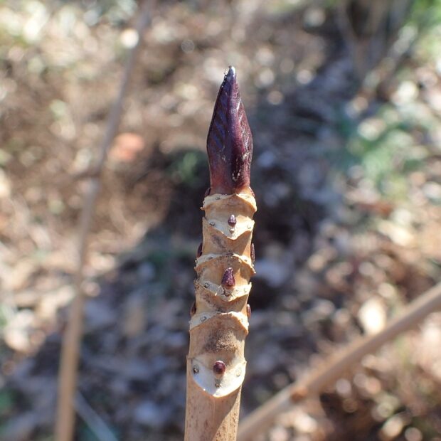 赤紫色の芽は、 裸の2枚の葉がぴちっと合わさったように閉じています。 葉が取れた痕はハート形で色白のお顔のようです。