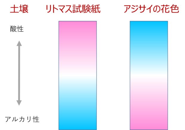 花(ガク)の色はリトマス試験紙と反対で、 酸性の土なら青、 アルカリなら赤になります。