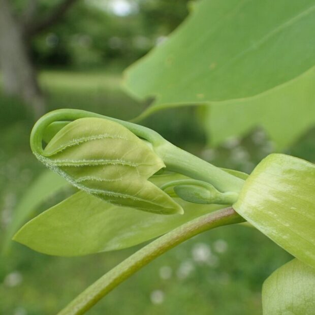 ユリノキの冬芽はアヒルの口に似ています。 春、 アヒルの口が開いて折りたたまれた小さな新葉が開く様子は本当にかわいいです。