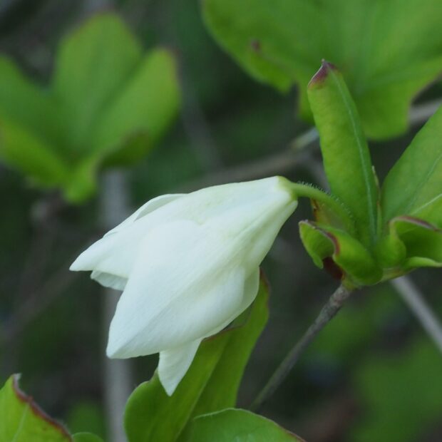 葉が成長するのとほぼ同時に枝先に1~3個の花をつけます。 純白の花をよく見ると緑色の模様があります。 これは「蜜がここにあるよ!」と虫に知らせているのです。
