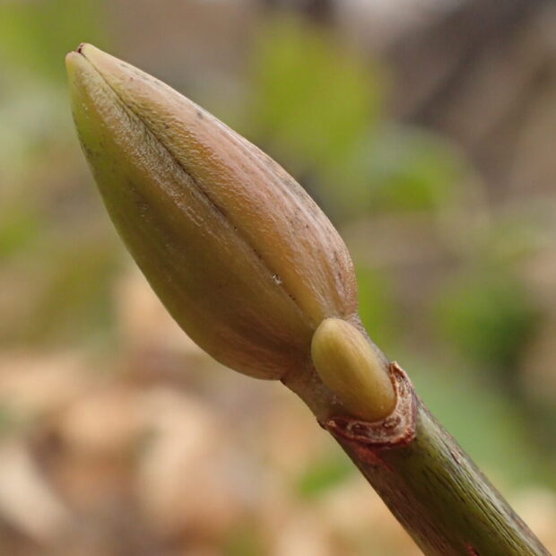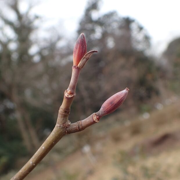 紅色や紫がかった紅色の芽で、 大きくて目立ちます。 芽鱗は2枚あり、 芽をぴっちり半分ずつおおっています。 葉痕の維管束痕は3つで、 お顔に見えます。