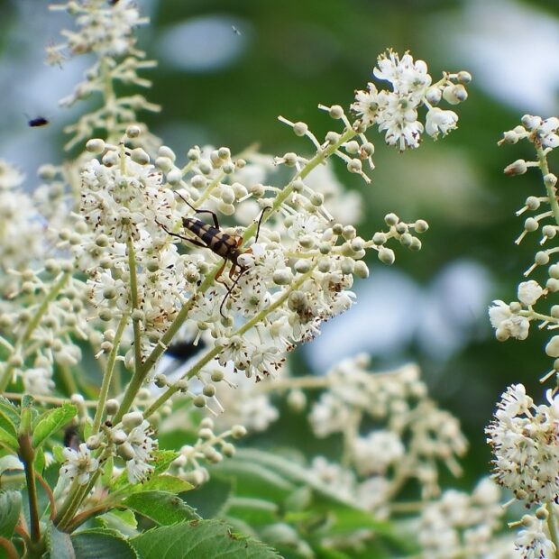 リョウブの花が咲く時期は他の花が少ないせいか、 花にはさまざまな昆虫が集まります。