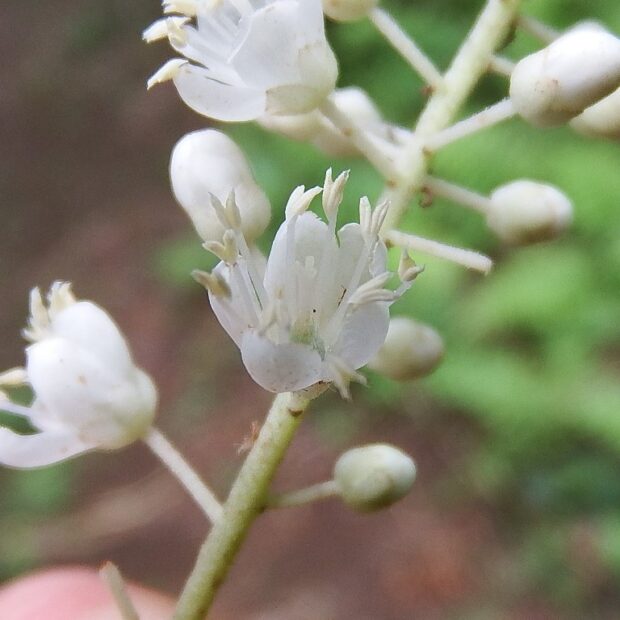 6~8月に房状の花の枝を出し、 花弁が5個の白い花を多数つけます。 雄しべは10本出ており、 花弁より長いため特徴的です。