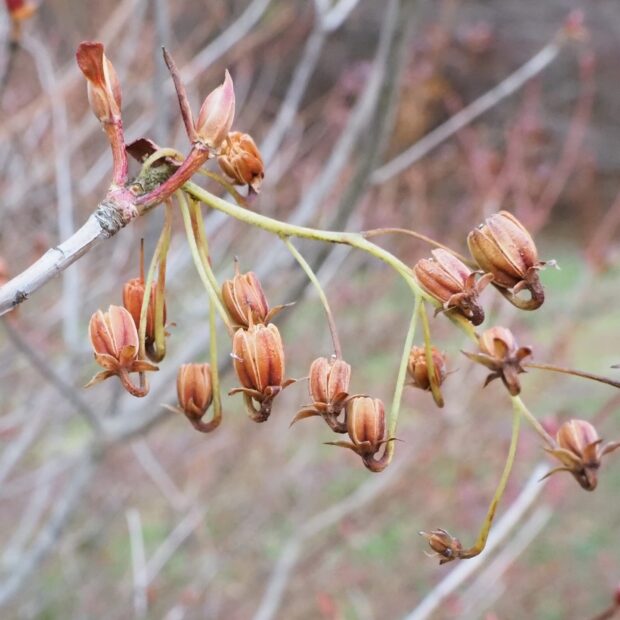 実は長さ6~8㎜で熟すと割れます。 実の枝は垂れ下がりますが、 果実は上向きになります。 種は、 周囲に不規則な翼があります。