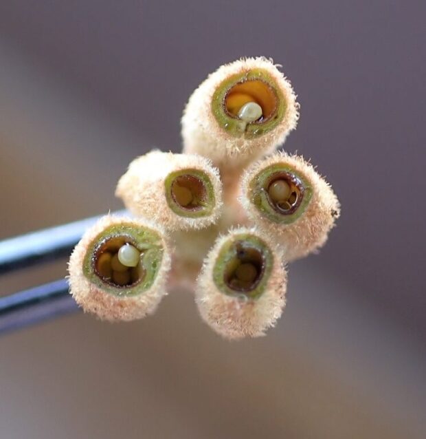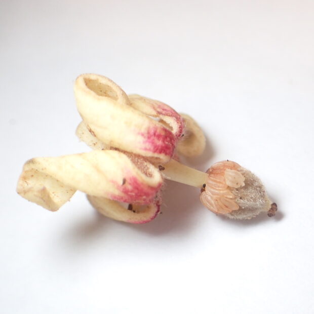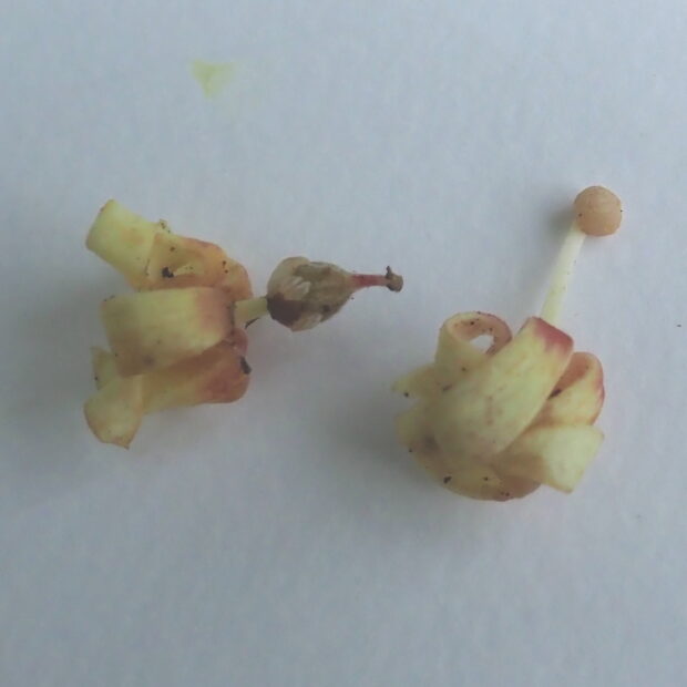 • 未熟な実は袋状。 切ってみると小さな種が入っていた。