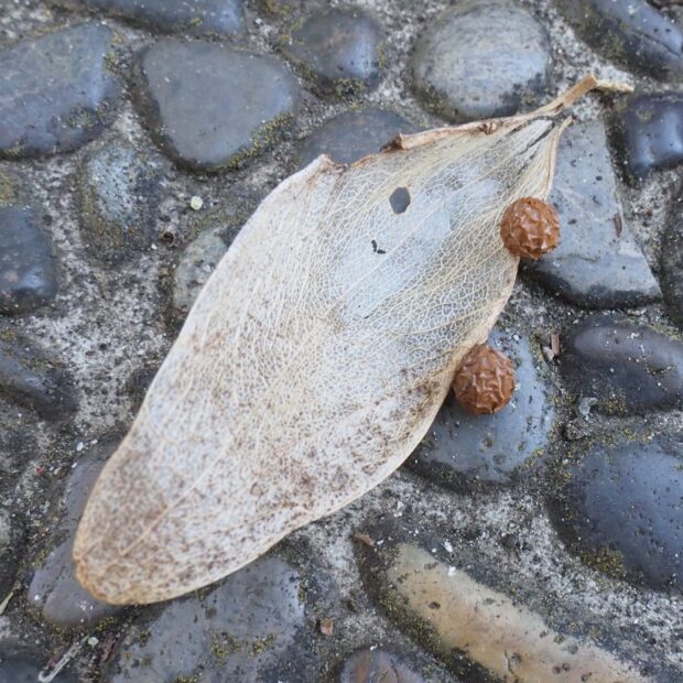 • 落ちた実。 裂けてスプーン型の皮に種がついている