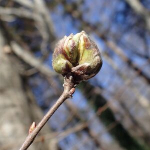 卵形で先端がややとがります。 鱗のような芽鱗(がりん、 芽をつつむうろこ状の皮)は12~14枚もあって、 きれいに並んでいます。
